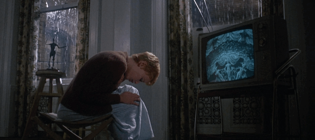 The film critiques precisely this cultural ideal, unraveling the autonomous 60s housewife. Wielding the apartment as the main setting, it dissects the patriarchal forces behind the analogy of woman to house. The film initially aligns Rosemary with the false promises of housewifery, presenting her as possessing a certain level of control. She encourages Guy to take the apartment she desires, initiates sex, exerts power over interior decorating and domestic life, and self-advocates for pregnancy. The apartment reflects her sense of agency as she decorates it an inviting yellow, its roominess warm and safe. This space, where she expresses her individuality, is hers. Over time, the aesthetics and spatial use of the apartment change, reflecting the slow stripping away of her health and personhood as her concerns over her pregnancy pain are undermined. In a particularly haunting scene, she hunches in front of her TV writhing in pain as rain pours down outside. The blue, dark lighting and low angle construct the space as a cold, unyielding force that looms so large it smothers her. Through the visually, spatially morphing apartment, the film illustrates the “ideal” 60s home as not a place of freedom, but rather a space designed to contain and isolate women.