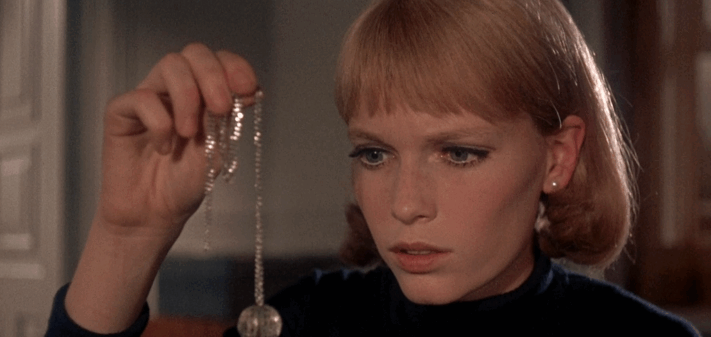 The Castevets’ cult and Guy’s manipulation and abuse of Rosemary’s body for their own ends illustrates how these spaces serve patriarchal structures. It’s in “her” domestic space, where both figures control and isolate Rosemary from her friends, seeking knowledge, and her own bodily knowledge. During their first appointment, Dr. Sapersiten, a cult-friend of the Castevets, orders Rosemary not to read books or listen to her friends. When she begins experiencing grueling abdominal pain, Saperstein scolds her for reading a pamphlet on ectopic pregnancy and purposefully misinforms her that the pain is from her pelvis expanding. He continually tells her the pain will subside, but we heartbreakingly watch these hollow reassurances contrast with Rosemary’s sickly decline. After Rosemary tells Guy she’ll be seeking a second opinion from Dr. Hill, her original doctor, he coerces her to not see him. Once she begins to piece together that the Catevests are witches, he also prevents her from seeking knowledge on witchcraft, throwing away the book on witches gifted to her by her friend Hutch. The tannis root necklace gifted by Minnie amplifies these manipulations as its revealed controlling properties allow these deceptions to take hold of Rosemary’s psyche without much resistance. The necklace and its surrounding lies symbolize just how easily dominant cultural ideals control and isolate women from their sense of self.